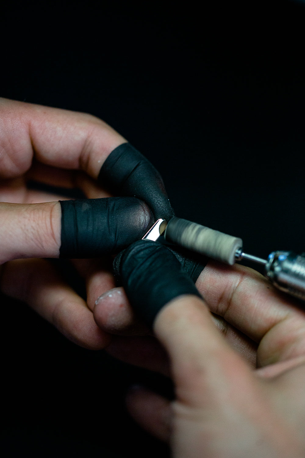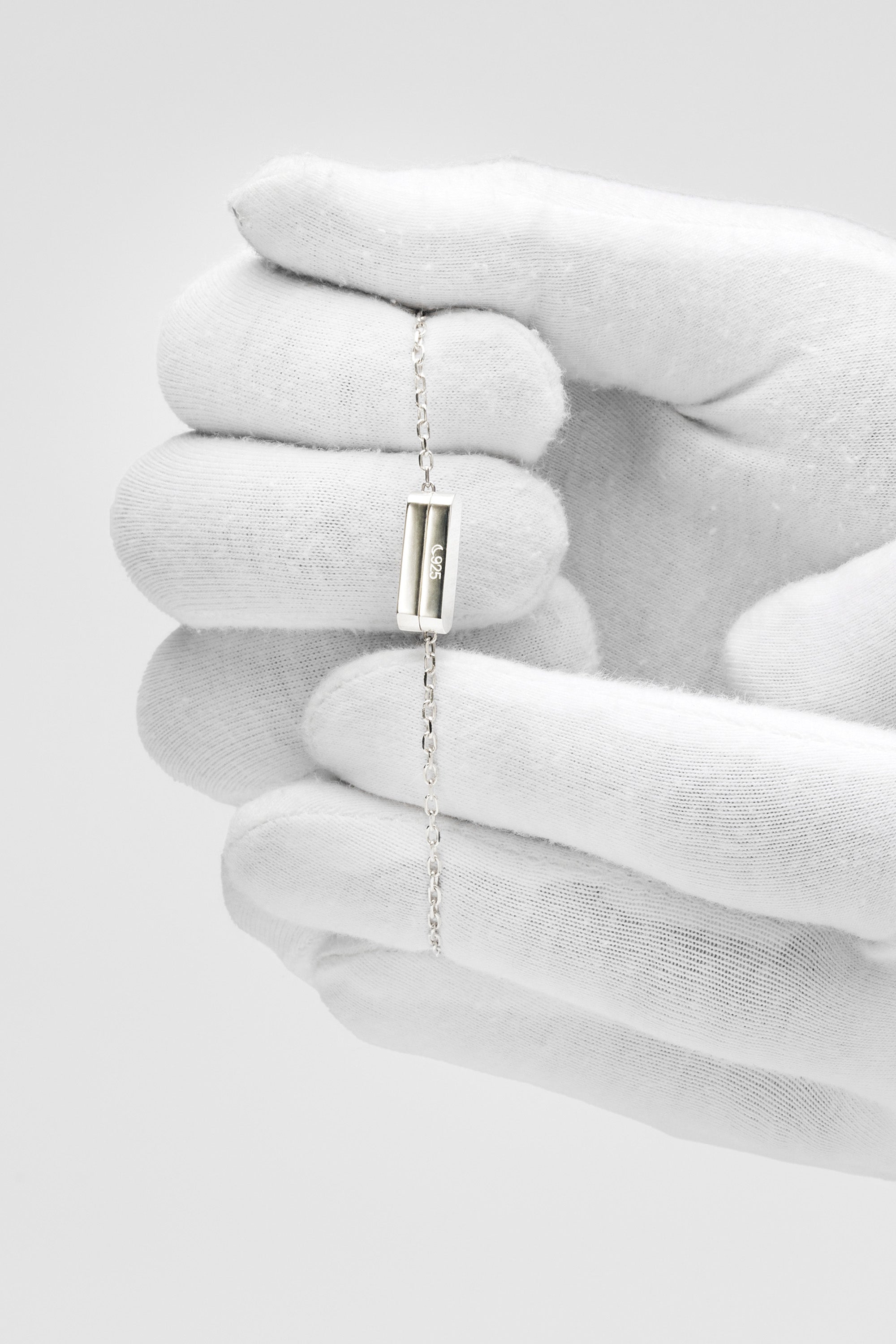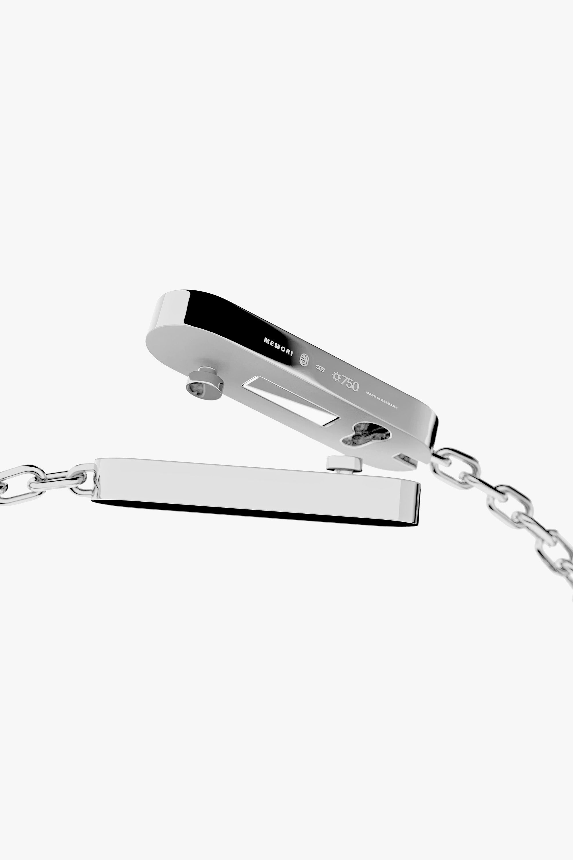 Die klassische Ankerkette mit Diamantschliff wird in Erwachsenengröße geliefert und kann von Juwelier:innen oder Goldschmied:innen jederzeit angepasst werden. Der Verschluss, der gleichzeitig als Anhänger dient, ist inspiriert von einem industriellen Rotationsmechanismus. Er erinnert an einen schlichten Goldnugget und bietet eine feine Gravurfläche für persönliche Botschaften.